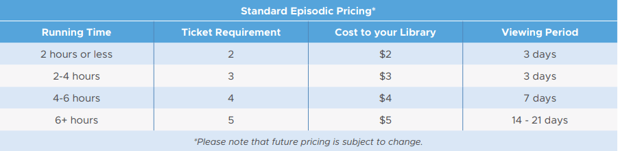 - Bingeable episodic content (including The Great Courses): Pricing, tickets, and viewing period variable based